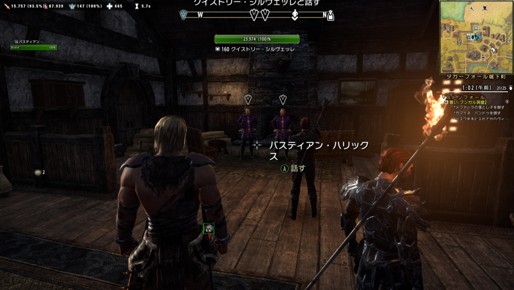 そしたら、ダガーフォールの酒場に行ってくれ、みたいなことを言われていたので、ちょうどカバナント編の開始場所がダガーフォールだったから、酒場に行ってクエを進めてみることにした。