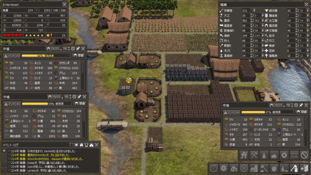特に薪が無くなって、石炭を消費しはじめて、鋼の道具が作れなくなって、生産力が落ちるっていうパターンが多いから、薪割り場を増やしたりしてるんだけど、どうも難しいねぇ。