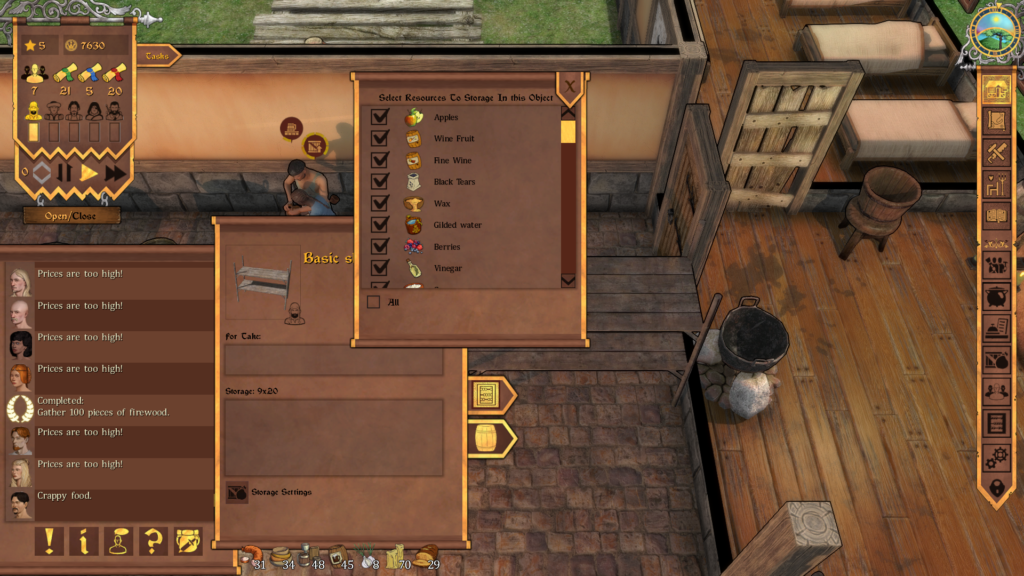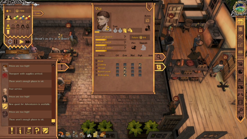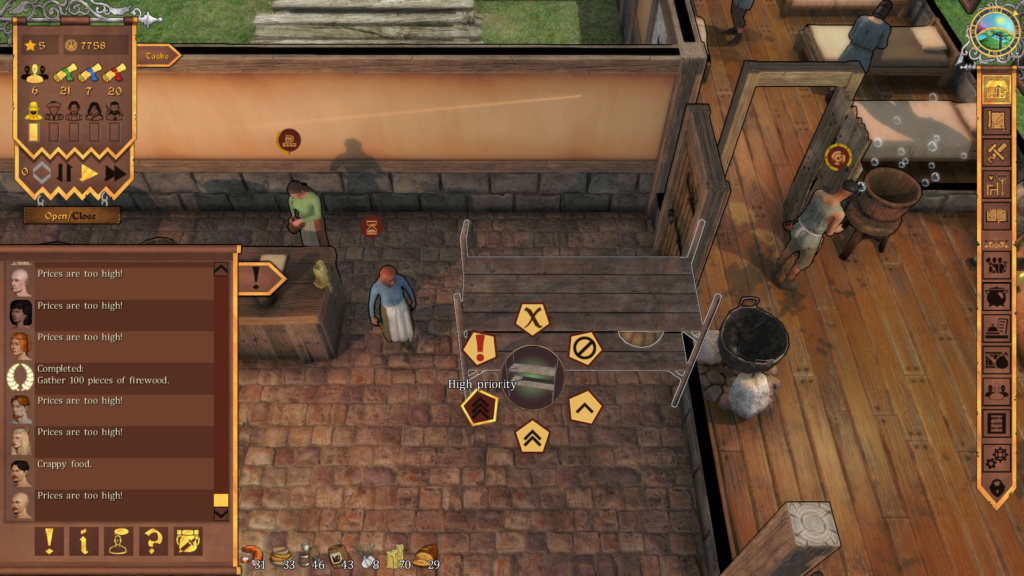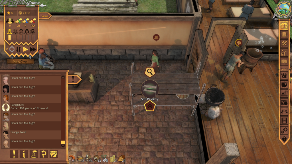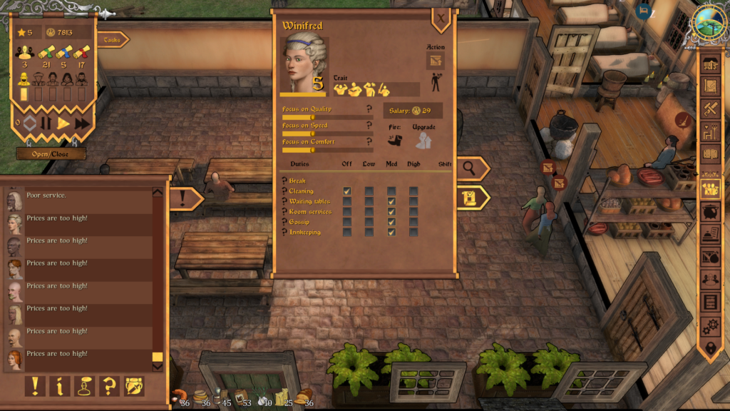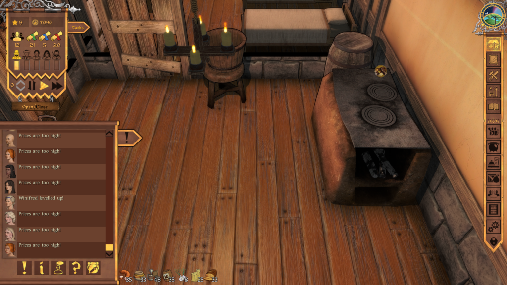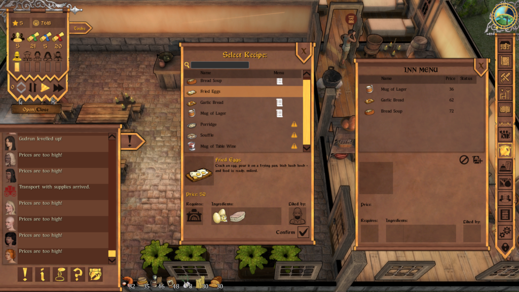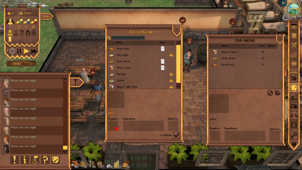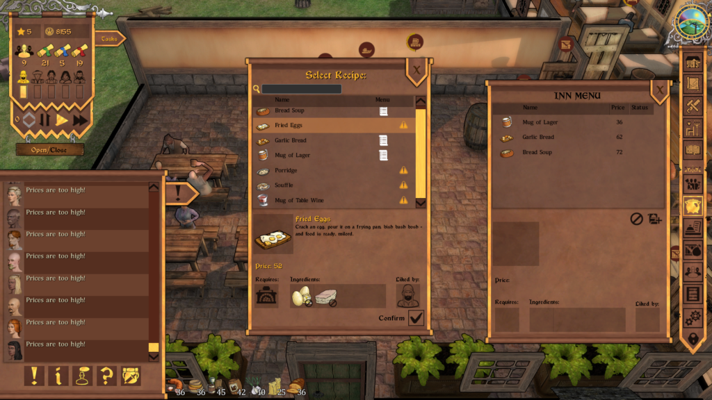 金額が客の感情に直結するようになったようです。そういえば、新しく「Prices are too high!」というメッセージが出るようになりました。ウチの宿屋は高めにしてあるんですよwシムシティの税金のように、安くしたほうが評判が上がる感じになるのでしょうか。