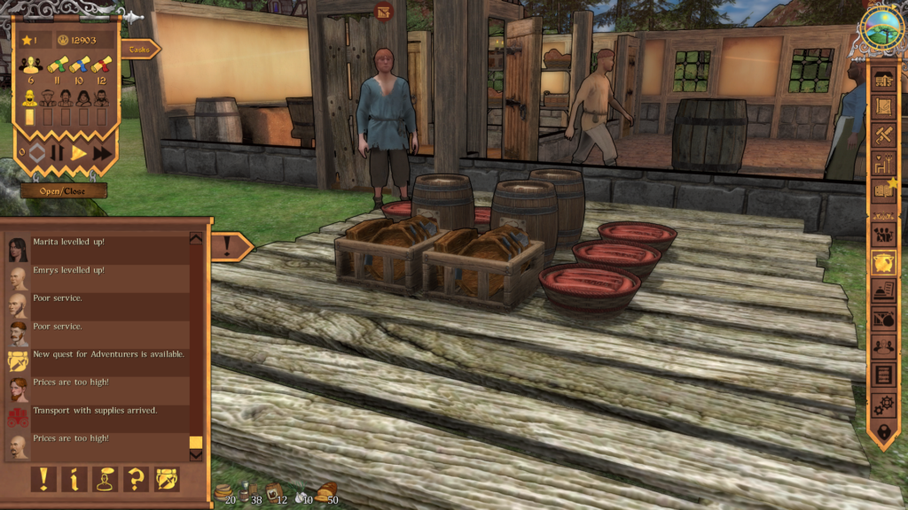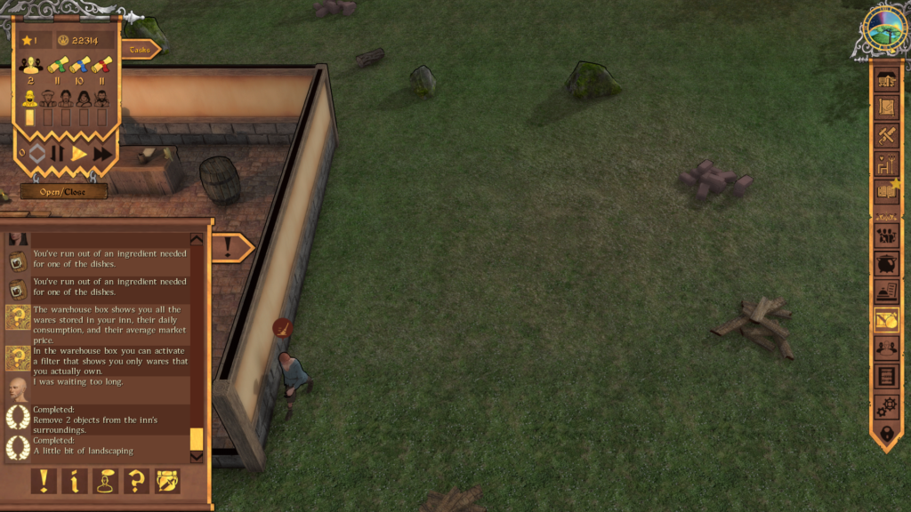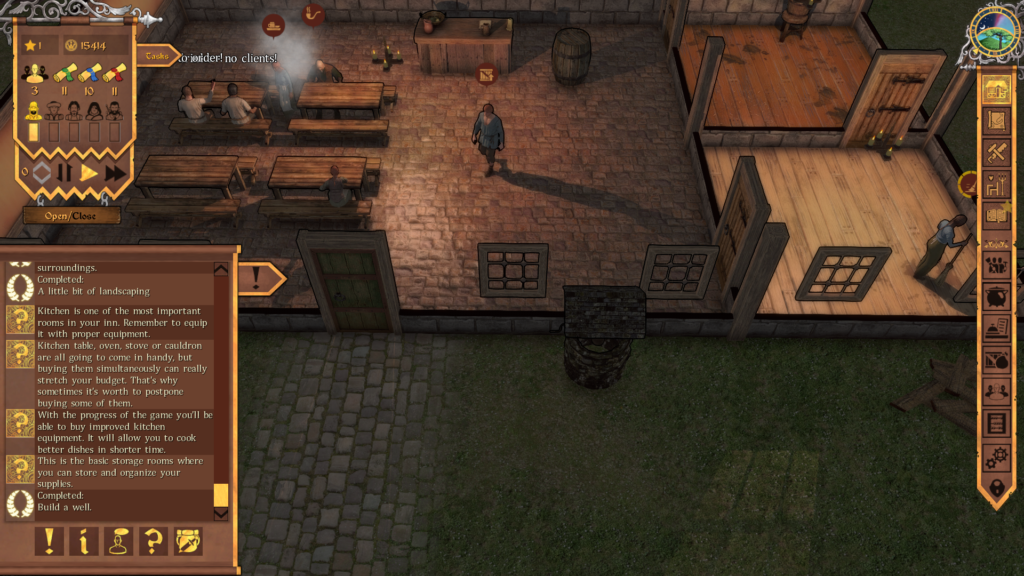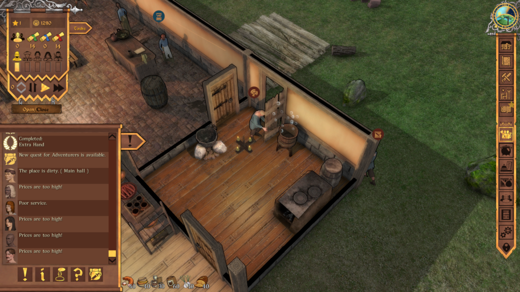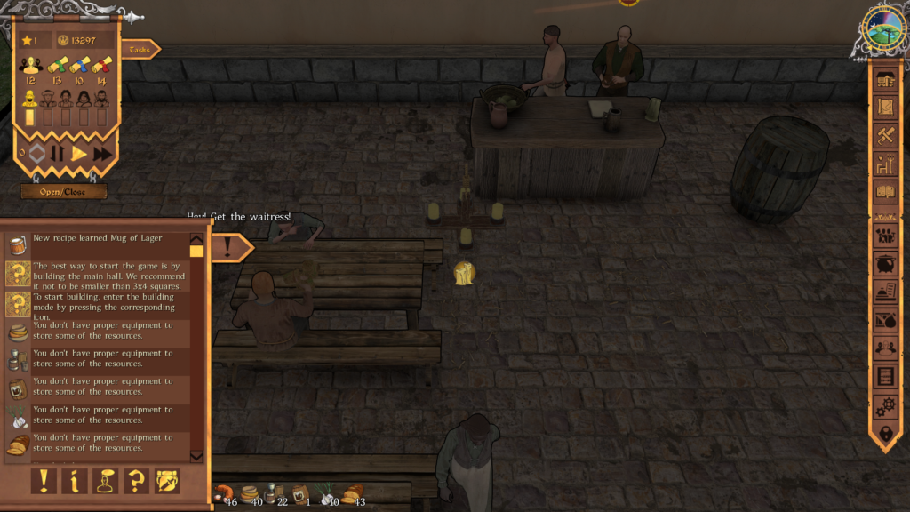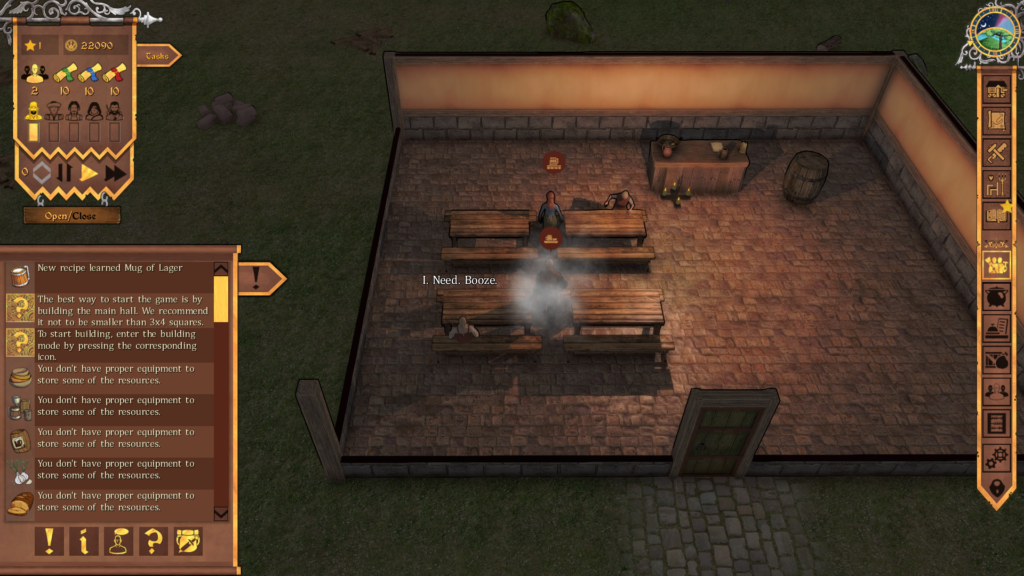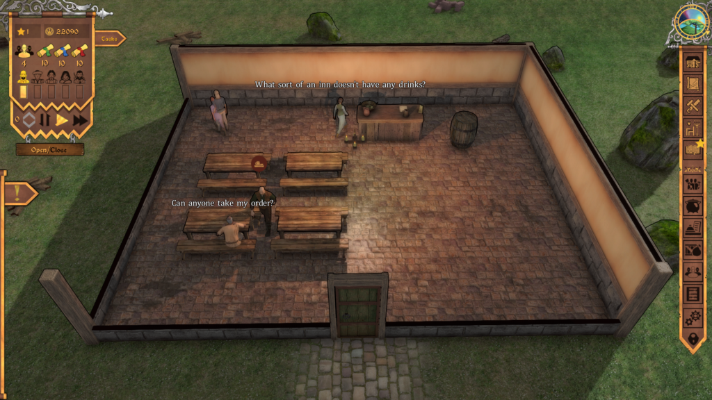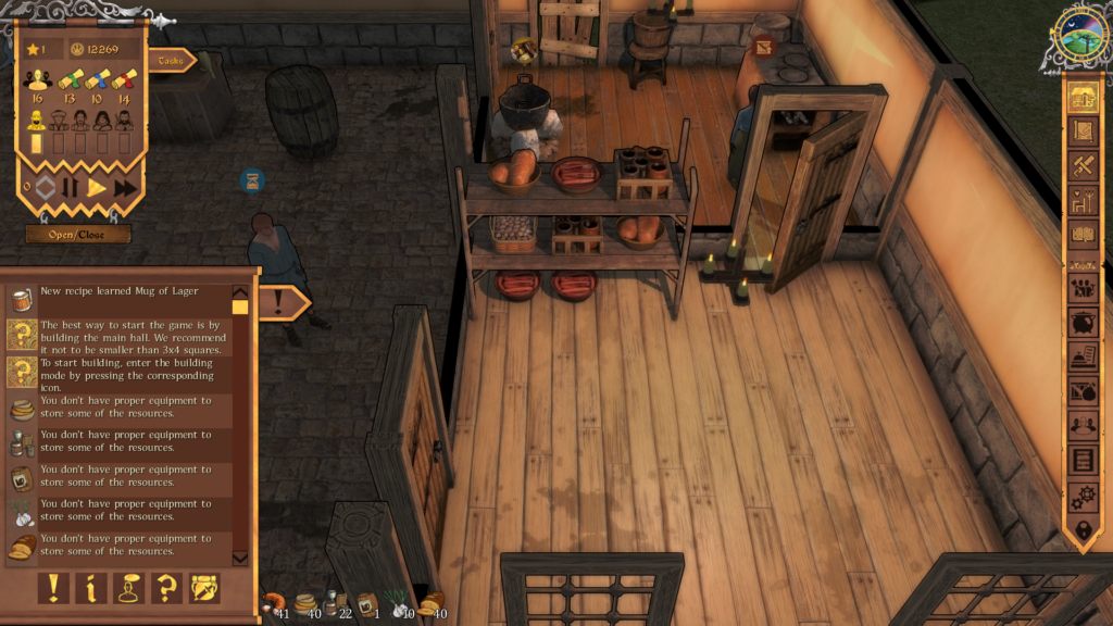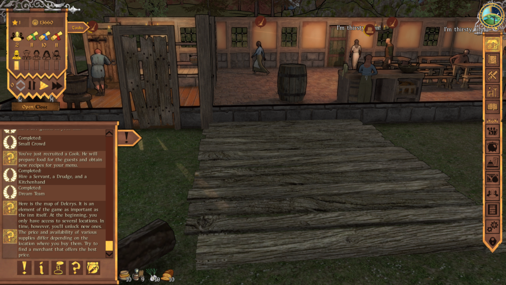前回はメインホールの建築まで進めました。今回は宿屋に客を入れてお酒を販売してみましょう。