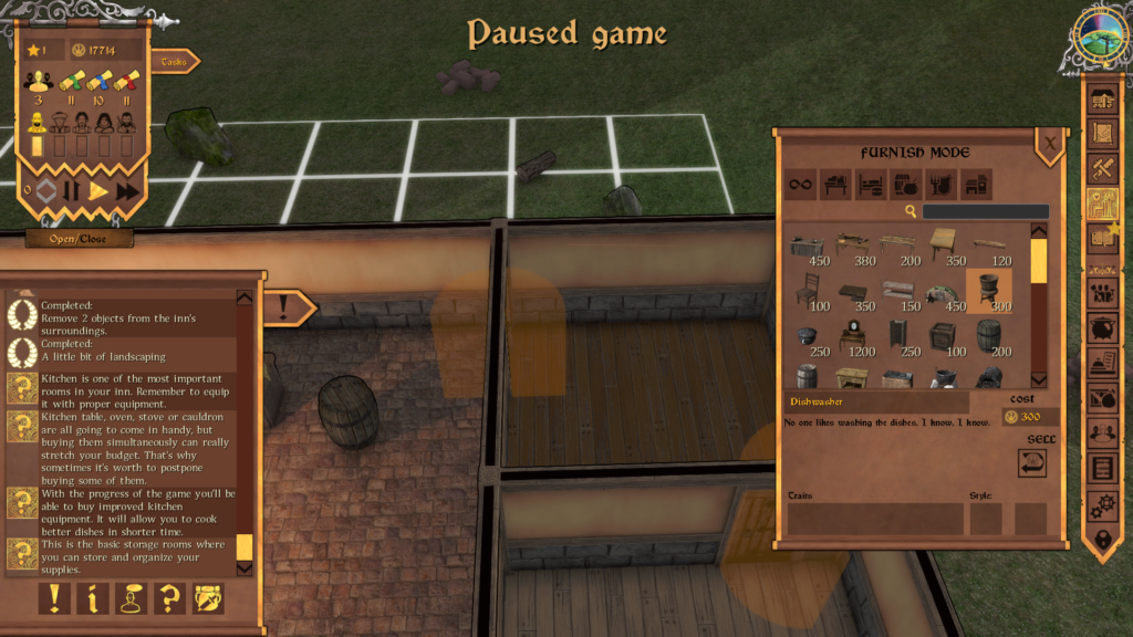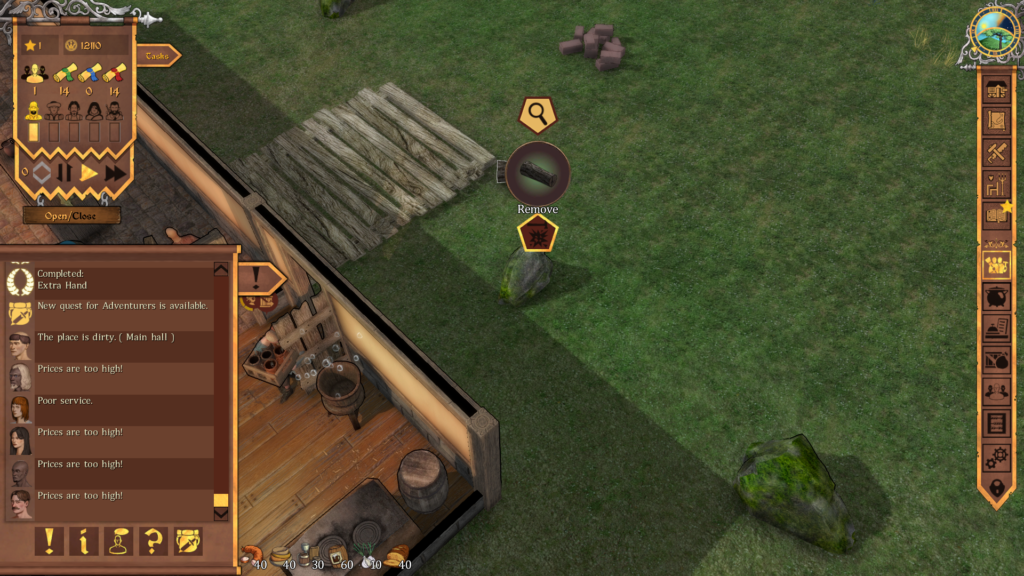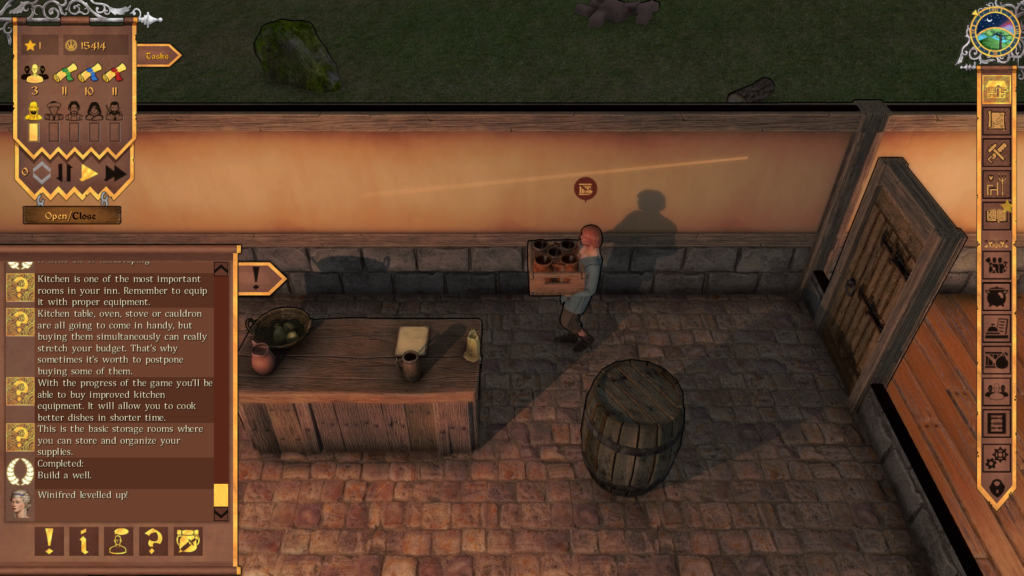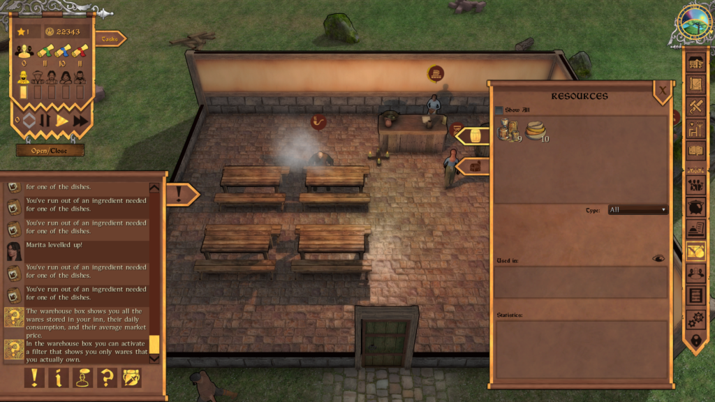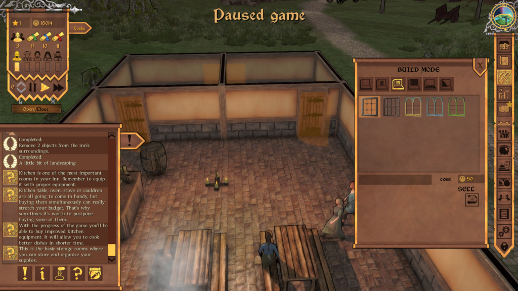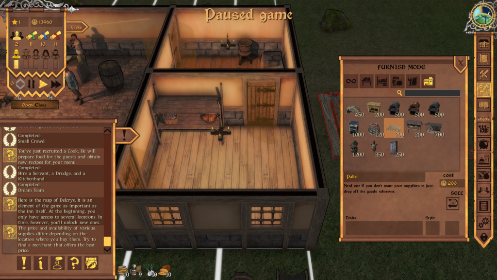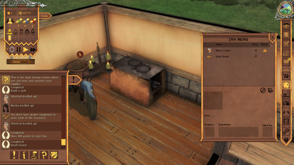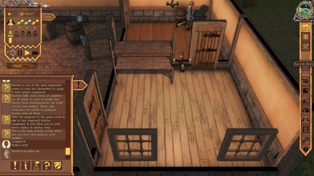 前回はメインホールの建築まで進めました。今回は宿屋に客を入れてお酒を販売してみましょう。