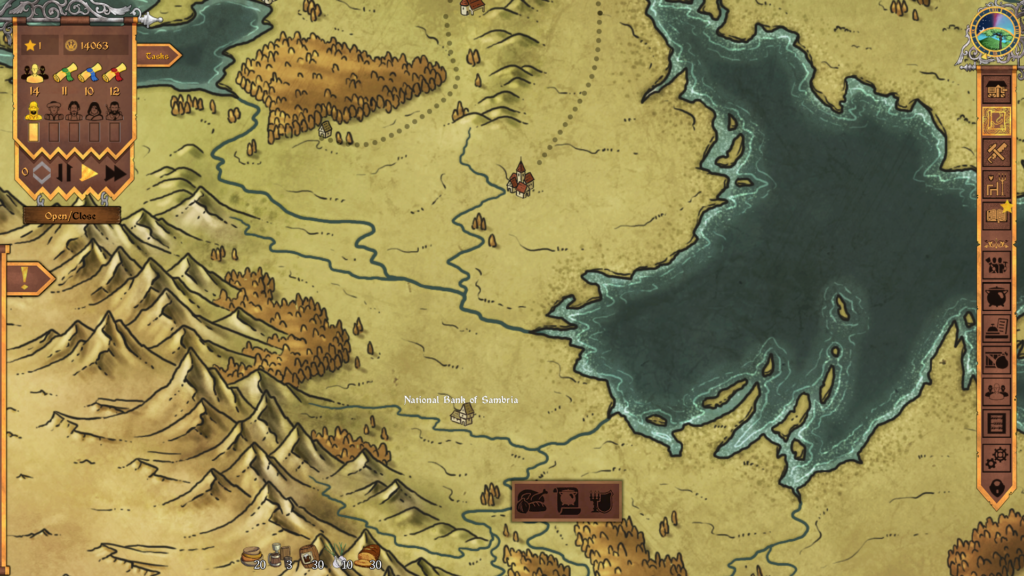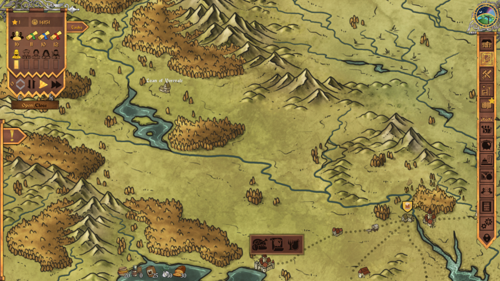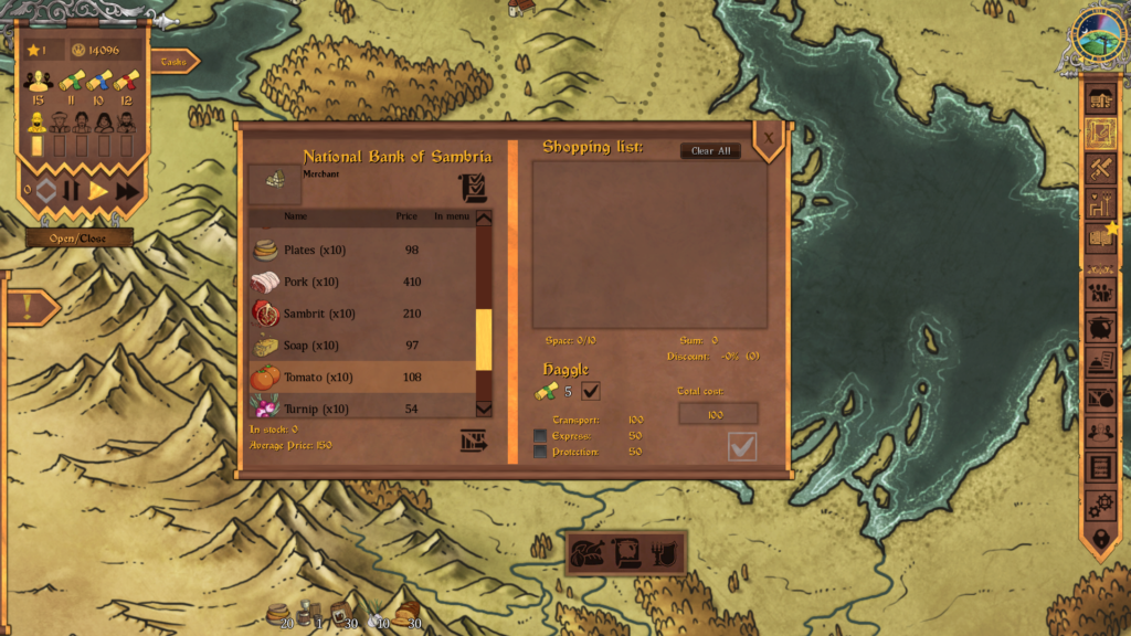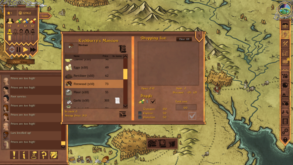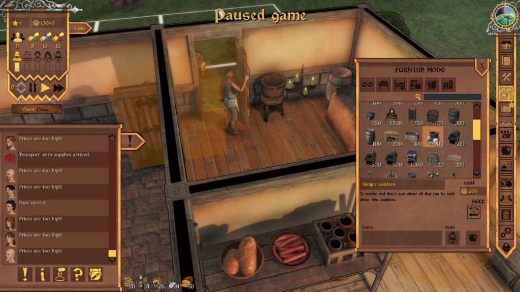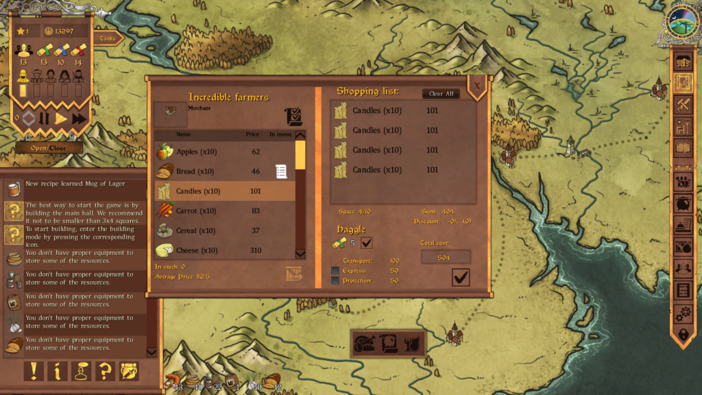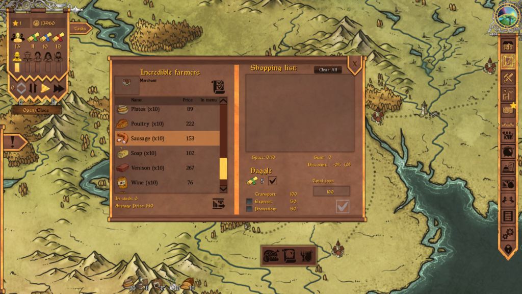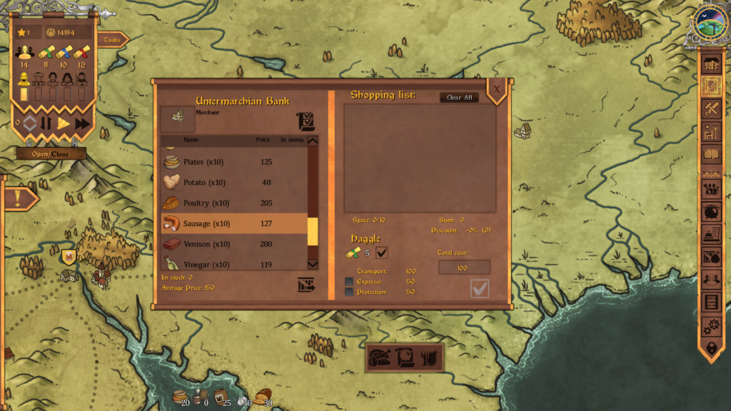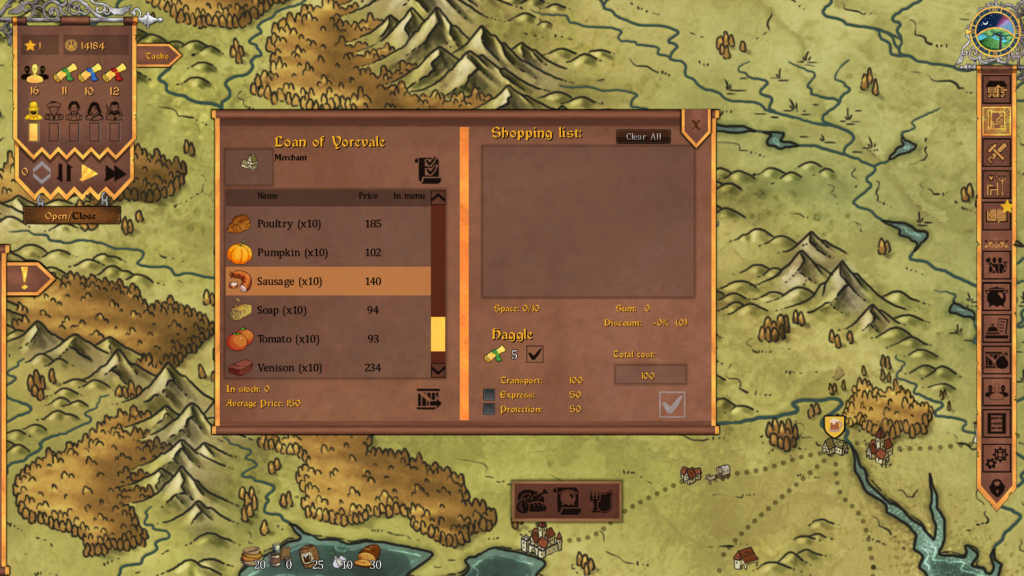 これを作っていきたいのですが、材料となるのはパンと水とソーセージ。パンは前回多めに購入してあり、水も井戸からほぼ無限に入手可能なので、ソーセージを他の街から仕入れます。