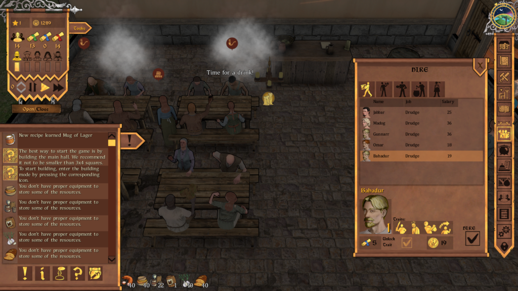 上の画像のワーカーのポートレートの右側にスキルが4つ並んでいますが、1番目と4番目のスキルだけオープンになっています。1番目のスキルは、「勇敢」、4番目のスキルは「スピーディ」を表しています。特に4番目のスキル「スピーディ」は神スキルで、これを持っている人は優先的に雇っていきたいです。