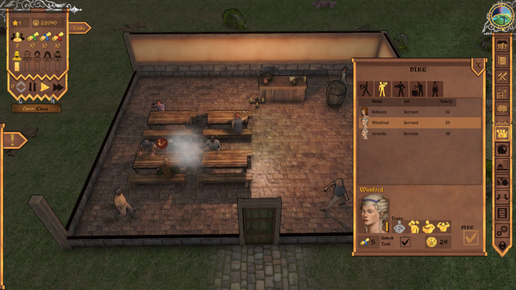 人によって色々と個性があるのですが、最初だから一番安い人を雇ってみましょう。右下の「hire」ボタンを押すことで従業員を雇用できます。